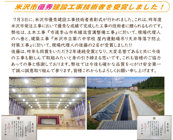 本日、米沢市で令和元年度の米沢市内工事案件内、成績優秀な技術者の中で過去3年工事成績優秀・今年度優秀工事の現場代理人・